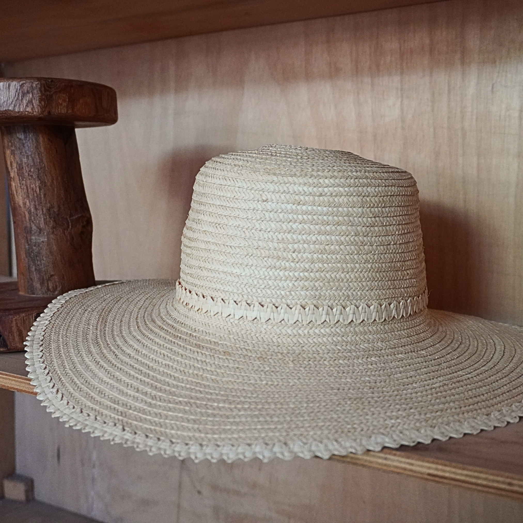 Su diseño amplio no solo protege del sol, sino que también enmarca el rostro con un aire natural y sofisticado. Cada vuelta del tejido guarda la paciencia del trabajo manual y el respeto por la materia prima local.